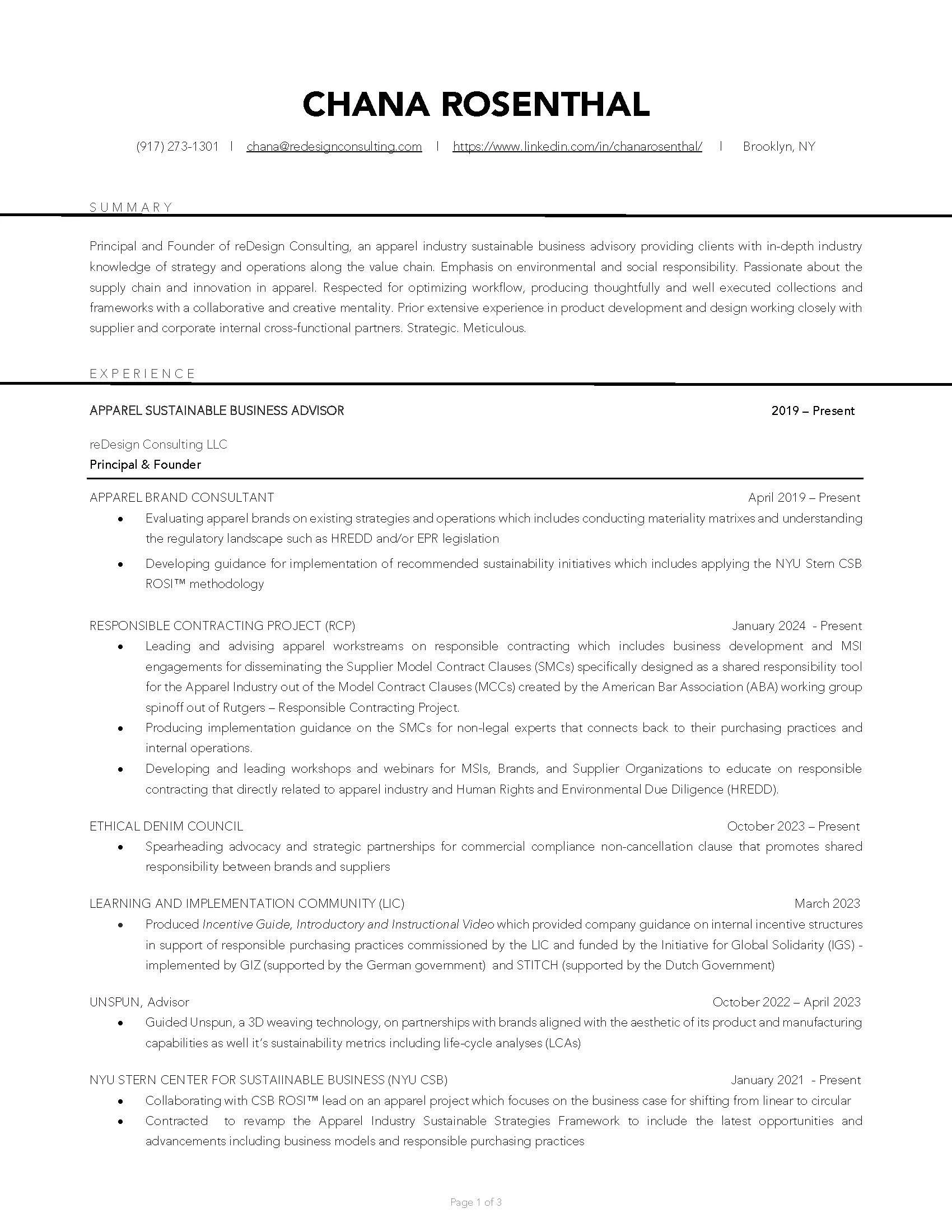 Advisory Roles: Board and advisory positions at American Circular Textiles (ACT), the Ethical Apparel Index and Delivering Good.